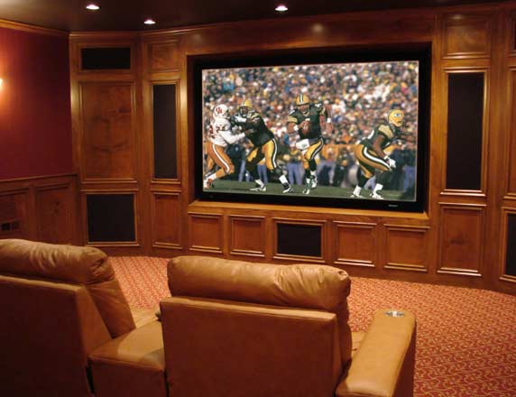 The client is a big Green Bay Packer fan, but his wife wanted all the equipment to be up off the floor and integrated into the cabinetry in this well crafted theater. Where have we heard that before? We were able to place the speakers inside the acoustically lined cabinetry and ceiling and located the electronics in a closet in the back. Everyone was pleased with the results.